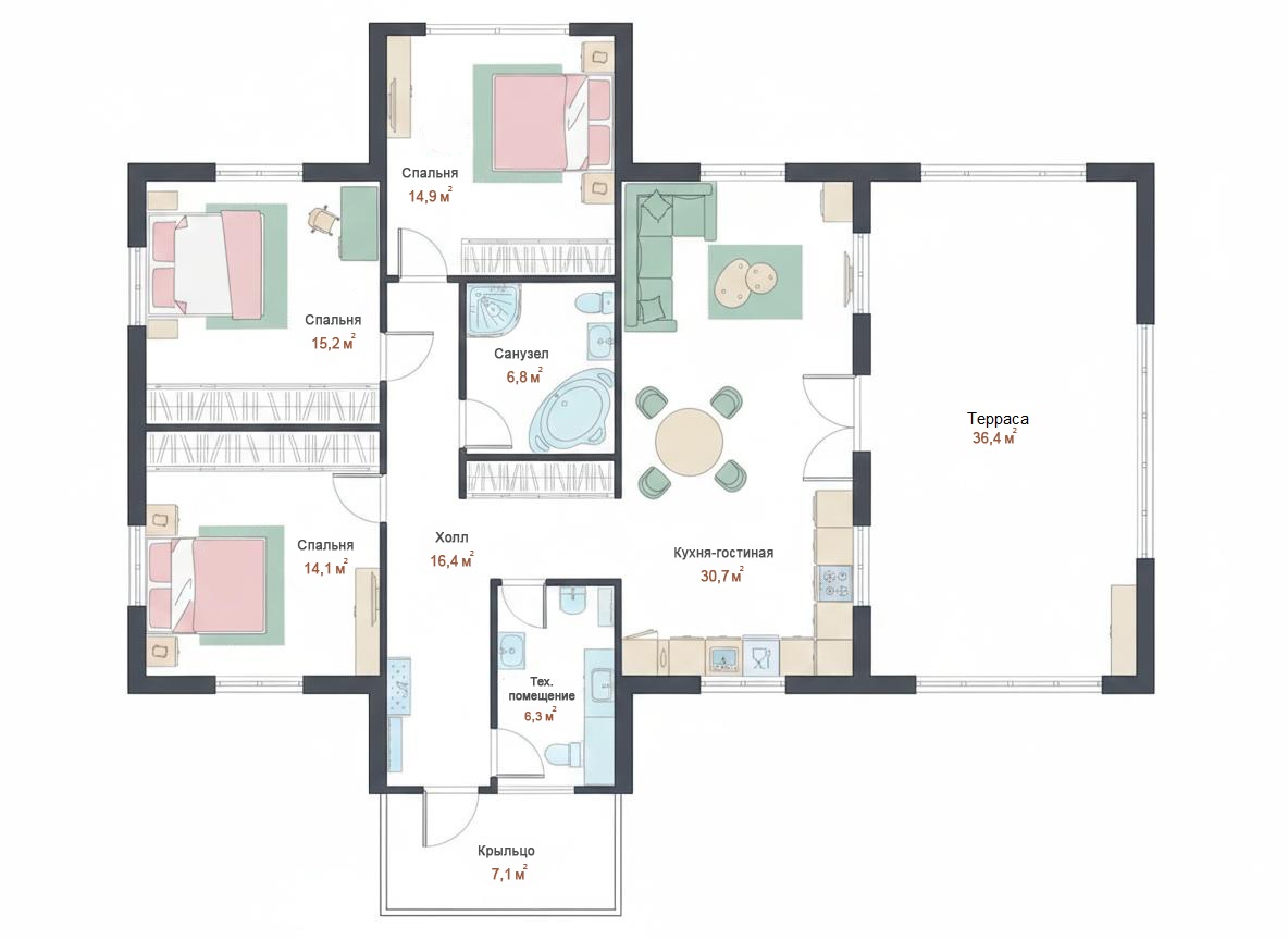 Проект «Мечта» — это коттедж, в котором главный акцент сделан на простор и «жизнь на свежем воздухе». Коттедж одноэтажный, общей площадью 162,5 м², поэтому все нужные помещения находятся на одном уровне, а повседневные маршруты по дому получаются короткими и удобными. Плюс здесь действительно большая терраса — 41,3 м²: её легко превратить в летнюю гостиную, обеденную зону или место для домашних праздников. Крыльцо 8,2 м² добавляет комфорта у входа — есть где спокойно снять обувь и занести покупки.